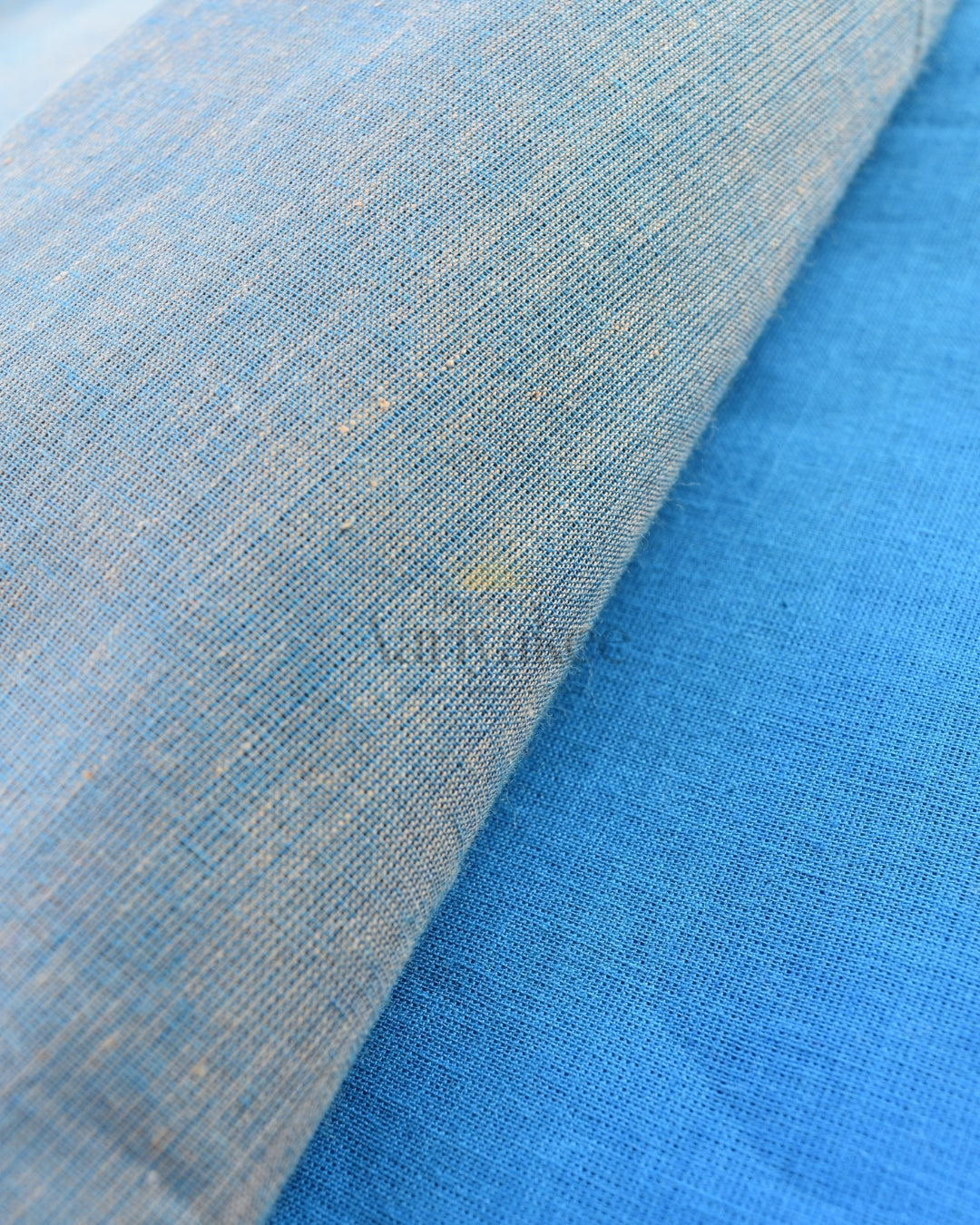 This handloom cotton set comes in a refreshing dual-tone of sky blue and aqua, adorned with zari woven borders in golden thread. Lightweight and breathable, it carries a crisp yet graceful finish, perfect for both casual elegance and festive charm. The subtle sheen of the dupatta complements the solid tone of the top, while the zari details uplift the overall look.