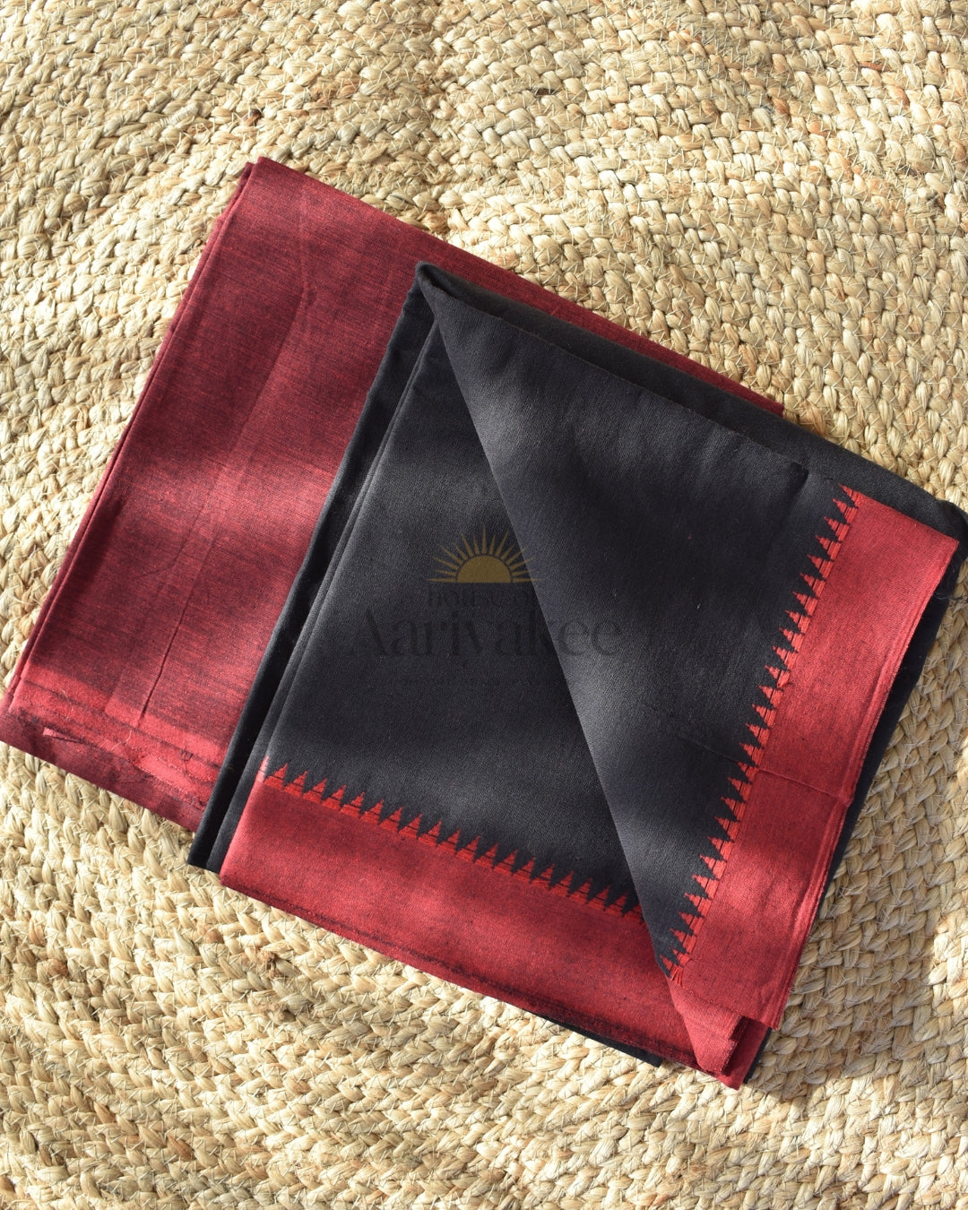 This handloom cotton set is a bold interplay of strength and elegance, defined by its striking temple border design. The top comes in a solid, inky black base—rich, grounding, and timeless—while the dupatta in deep madder red frames it beautifully with woven temple borders and tassels, carrying forward the essence of tradition. The bottom in coordinated black keeps the look balanced and versatile. Minimal yet powerful, this set celebrates the heritage of temple-inspired weaves with a contemporary edge.