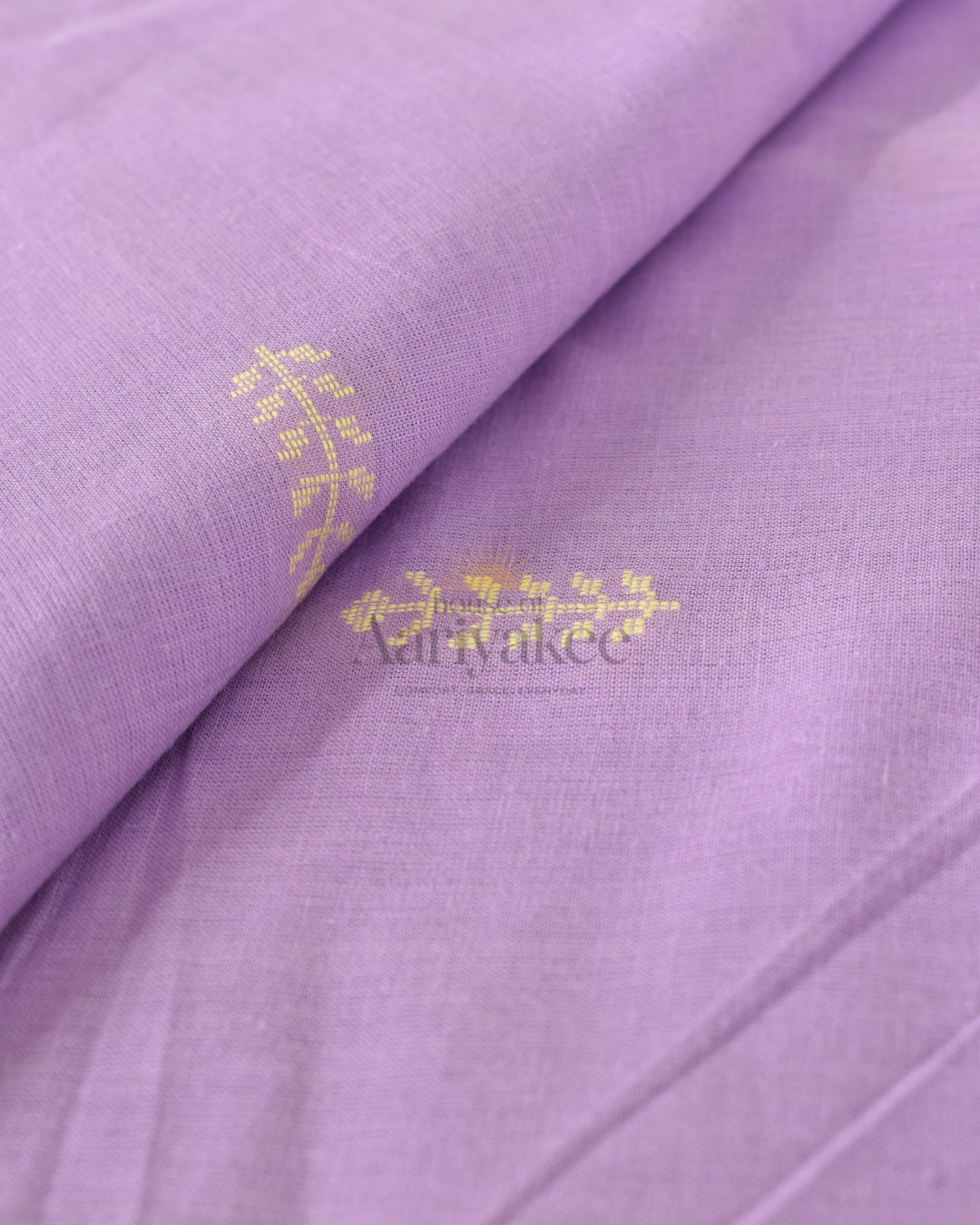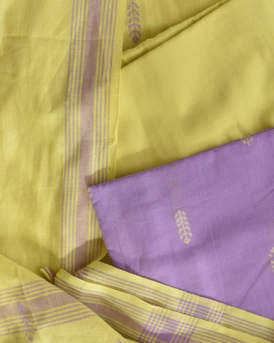 Experience subtle charm with this handloom cotton suit. The delicate lavender top features woven green leaf-like motifs, paired with a solid green bottom for a grounded feel. A matching green dupatta, adorned with delicate lavender motifs, completes this serene ensemble. Designed for everyday comfort and understated elegance.