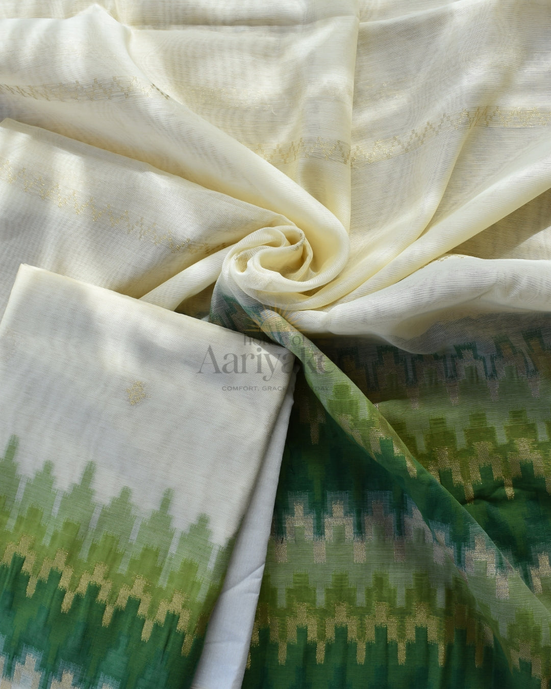 Immerse in the calm of nature with this Muga cotton set in a soothing blend of ivory and fresh green tones. The highlight of the fabric lies in its ikat-inspired woven pattern that transitions beautifully from light to deep green, creating a refreshing ombré effect. The soft, lustrous Muga cotton lends it a graceful drape, making it a timeless piece that radiates understated elegance.