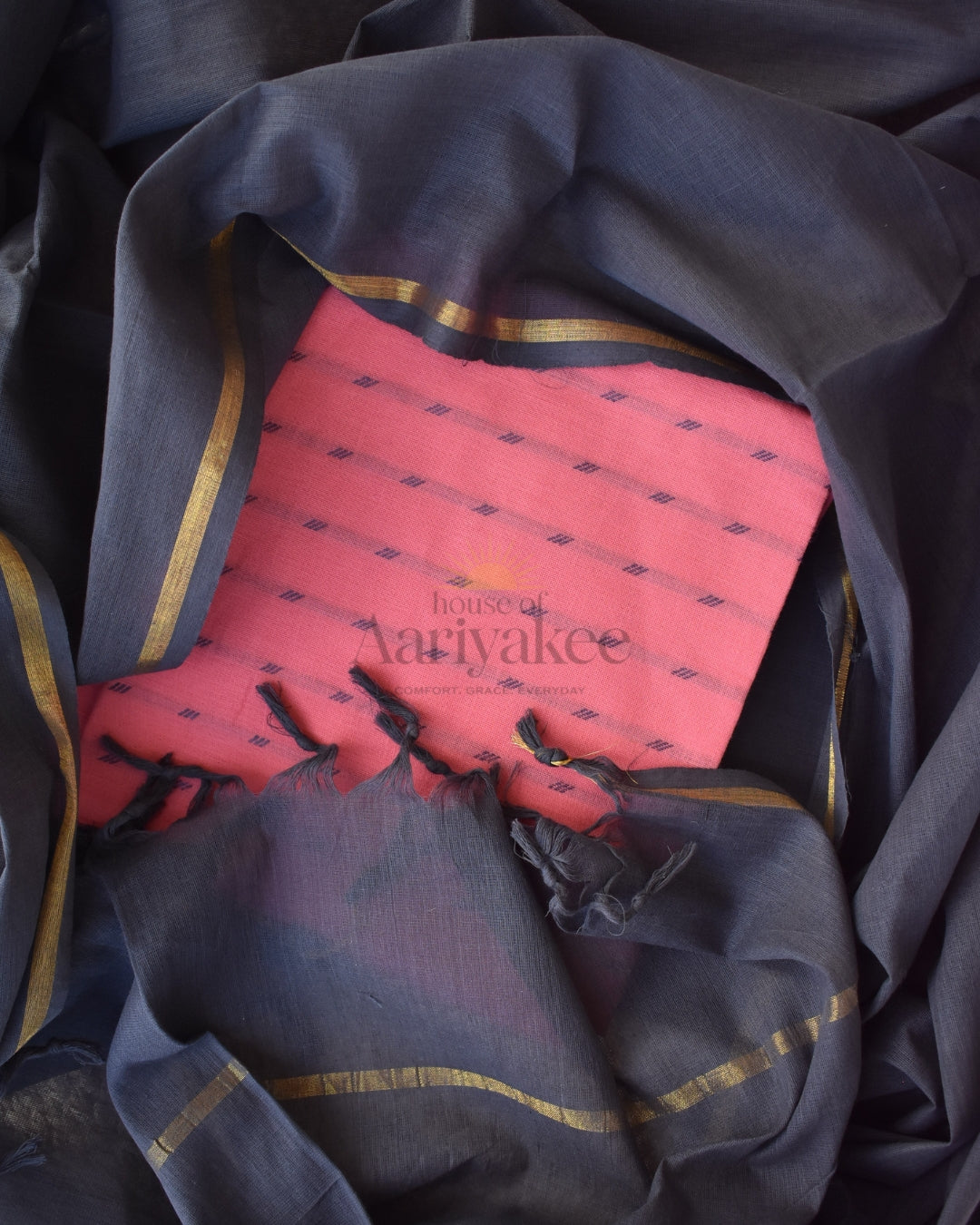 A graceful 3-piece handloom cotton set featuring a deep charcoal grey dupatta with golden zari borders, paired with a rose pink kurta fabric delicately woven with small navy motifs. The understated contrast between the vibrant pink and the muted grey makes this set both elegant and versatile, perfect for festive occasions as well as everyday sophistication.
