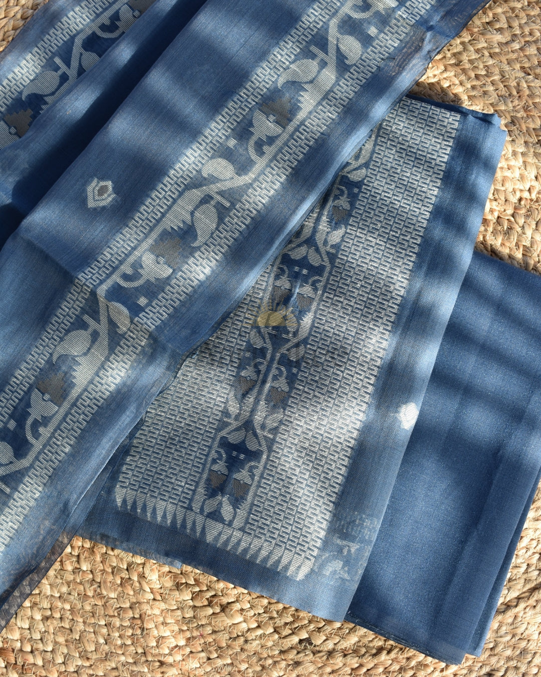 A graceful Muga cotton suit set in a serene denim blue shade, paired with a delicately woven dupatta featuring silver zari floral patterns. The natural sheen of Muga cotton gives it a rich, luxurious appeal while keeping it airy and comfortable for all-day wear. Perfect for elegant daytime occasions or subtle festive dressing.