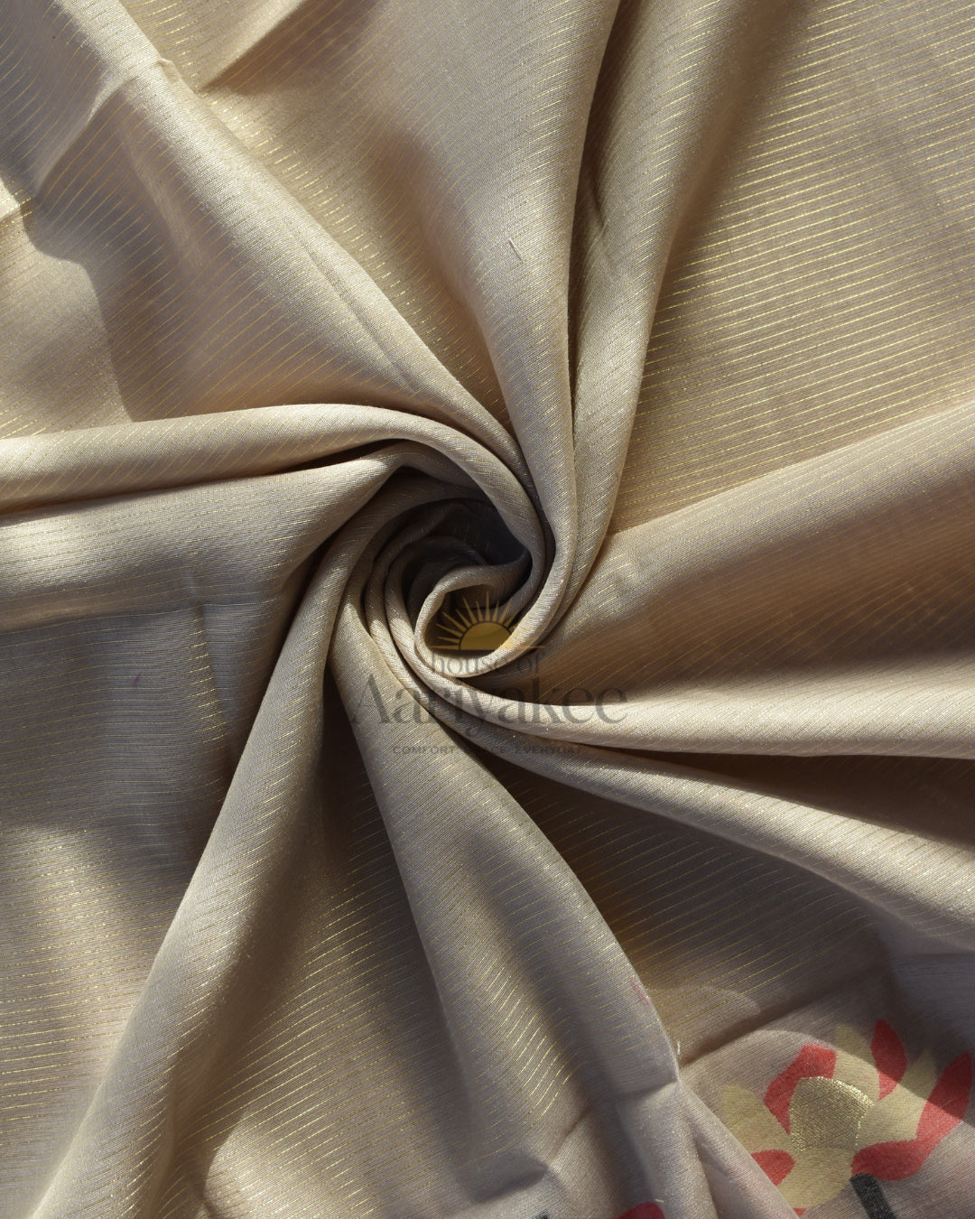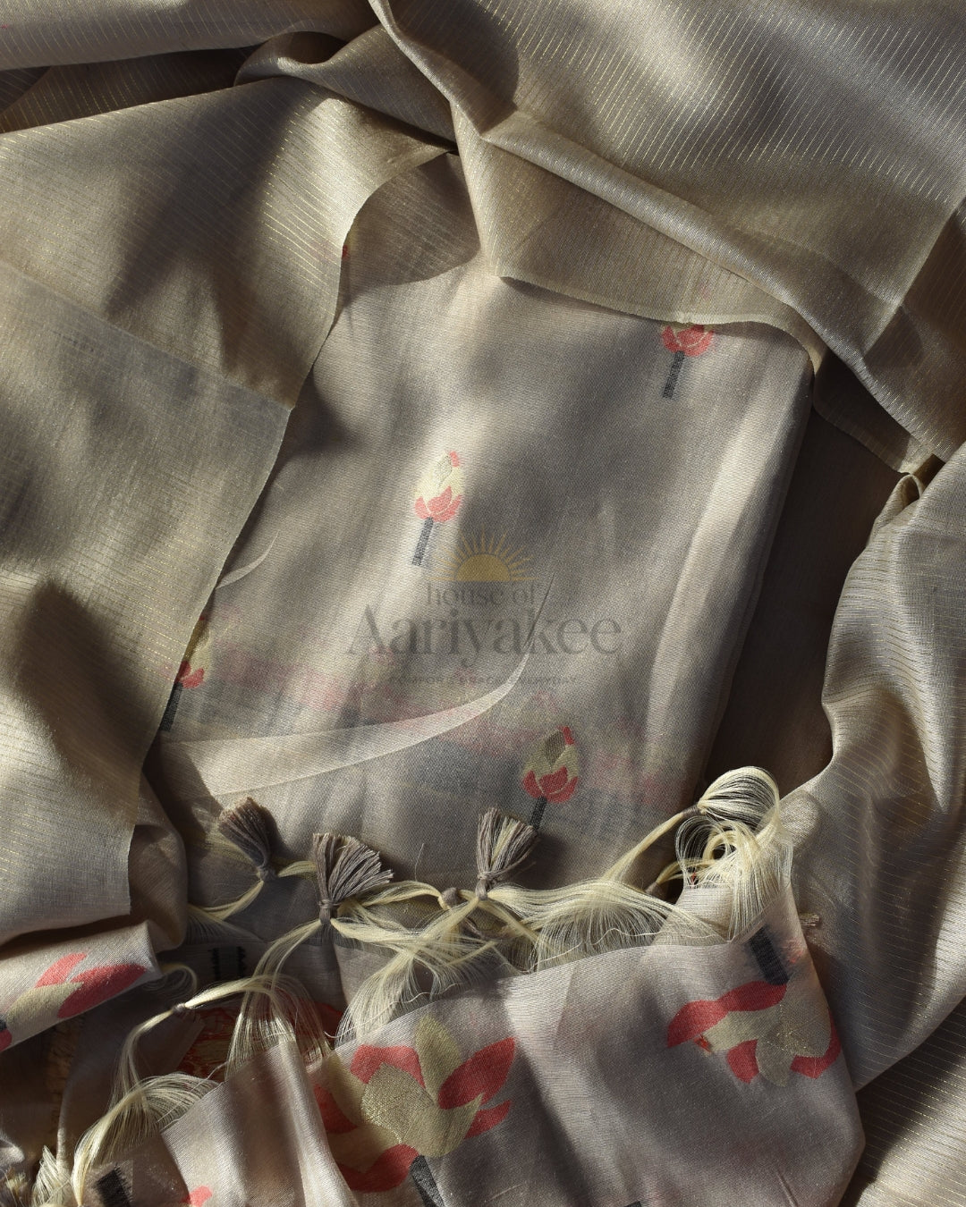 This elegant handloom cotton set in a soothing sand beige hue is adorned with delicate handwoven floral motifs in soft red and mustard yellow, creating a gentle contrast that feels earthy yet festive. The subtle woven texture and natural sheen give it a warm, timeless appeal — perfect for daytime gatherings, festive brunches, or quiet celebrations.