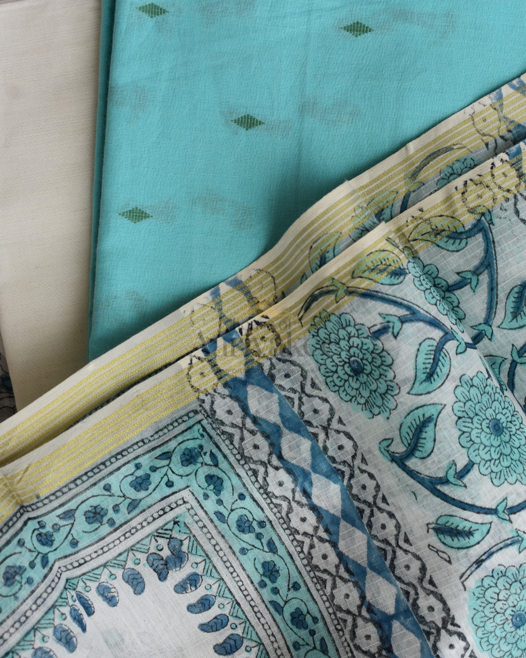 This three-piece handloom cotton suit is an ode to lightness and grace — featuring an aqua blue top woven with tiny green diamond motifs, paired with a soft off-white bottom that balances the look with quiet elegance. The highlight is the airy ivory dupatta, adorned with intricate floral block prints in shades of turquoise and blue, finished with subtle mustard detailing along the border. It’s breathable, breezy, and beautiful — perfect for days when you want comfort to meet charm, effortlessly.
