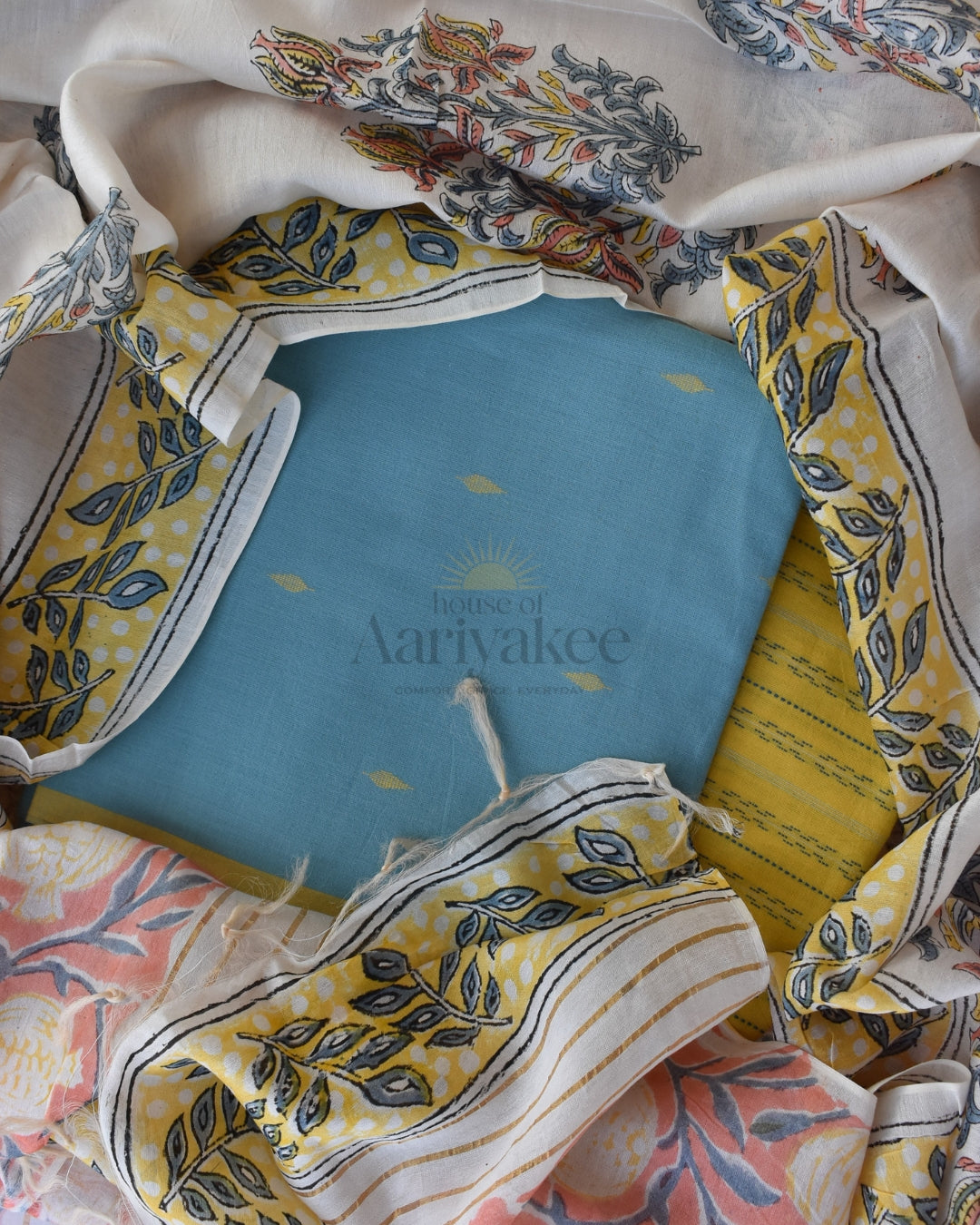 This vibrant 3-piece ensemble brings together a refreshing sky-blue top fabric with subtle woven yellow motifs, a sunny yellow bottom fabric with delicate linear patterns, and a cream dupatta adorned with floral hand-block prints in warm shades of coral, blue, and yellow. The dupatta is finished with leafy yellow borders that add a cheerful charm. Crafted in breathable handloom cotton, this set radiates effortless grace — perfect for everyday elegance, workwear, or festive gatherings.